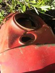 Eureka! Alors que le toit sur la photo 6.1 a été rapidement identifié par un certain John comme celle d’une Simca Aronde, la voiture sur les photos 6.2 semblait plus difficile à reconnaître. Mais par hasard, Gilbert m’a envoyé récemment plusieurs photos dont celle ci-dessous d’une épave d’une Renault Frégate à Bagnoles. Si nous comparons la photo d’un spécimen en bon état (le noir ci-dessous) avec la photo 6.2b, nous voyons que la carrosserie autour du phare correspond assez bien. Nous voyons également que la ligne de toit et l'ovale pour la calandre(6.2a) correspondent! Donc, l’épave à La Redorte devrait être une Frégate, probablement une Renault Frégate Amiral 1955-1958 (photo: Auto-Croisées). Il y avait différentes versions de la Frégate et l’épave à Bagnoles (ci-dessous) n’est pas un Amiral mais, compte tenu de sa calandre, une Frégate 1100 (1951-1955)