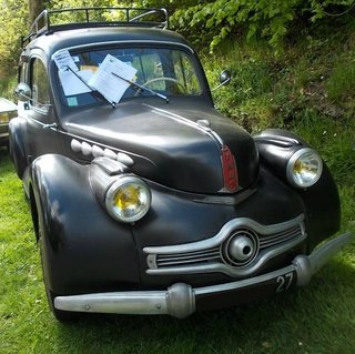Cette fourgonnette bleue se trouve dans un ravin à Cabrespine. Elle a également un lien danois: les premiers exemplaires de cet utilitaire étaient essentiellement exportés vers le Danemark. Cette destination ne doit rien au hasard, car dans ce pays la fiscalité favorisait délibérément ce type de véhicule. Ce n'était qu'à partir de juin 1949 que quelques exemplaires ont été vendus en France (source: André Leroux). Par contre un modèle avec une telle vitre latérale est complètement inconnu, c.a.d. cette vitre est plutôt propre à une Panhard Berline...Voilà, notre épave est une Panhard Dyna X Fourgonnette tôlée qui a été fournie d'une vitre latérale venant d'une Berline de la même marque (identifiée par Tony Vos). En regardant de petits détails je date l'épave Cabrespinoise entre mai 1951 et juin 1952.Ci-dessous deux photos d'une Dyna X Break (site Auto-Croisées). |