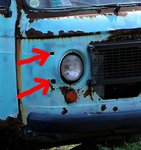 Le nom Motorfabriken Kalundborg disparaît en 1992 après une fusion, donc l'épave est antérieure à cette année. Est-ce qu'elle s'est accidentée en se dirigeant vers un client agriculteur ou un marbrier? Ou était ce fourgon une occasion, acheté par un globe-trotteur qui l'a abandonné à Caunes?Quoi qu'il en soit, on a enfin réussi à identifier cette épave comme étant une Fiat 238, en comparant (voir les photos ci-dessous) la forme et position de ses phares et clignotants, la position du réservoir d'essence et l'éclaireur de la plaque arrière. Cette Fiat, lancée en 1968, doit être fabriquée avant 1979 en raison de l'absence de deux petits trous (qui depuis étaient percés afin de fixer une calandre plus moderne. Voir les 2 flèches rouges). |